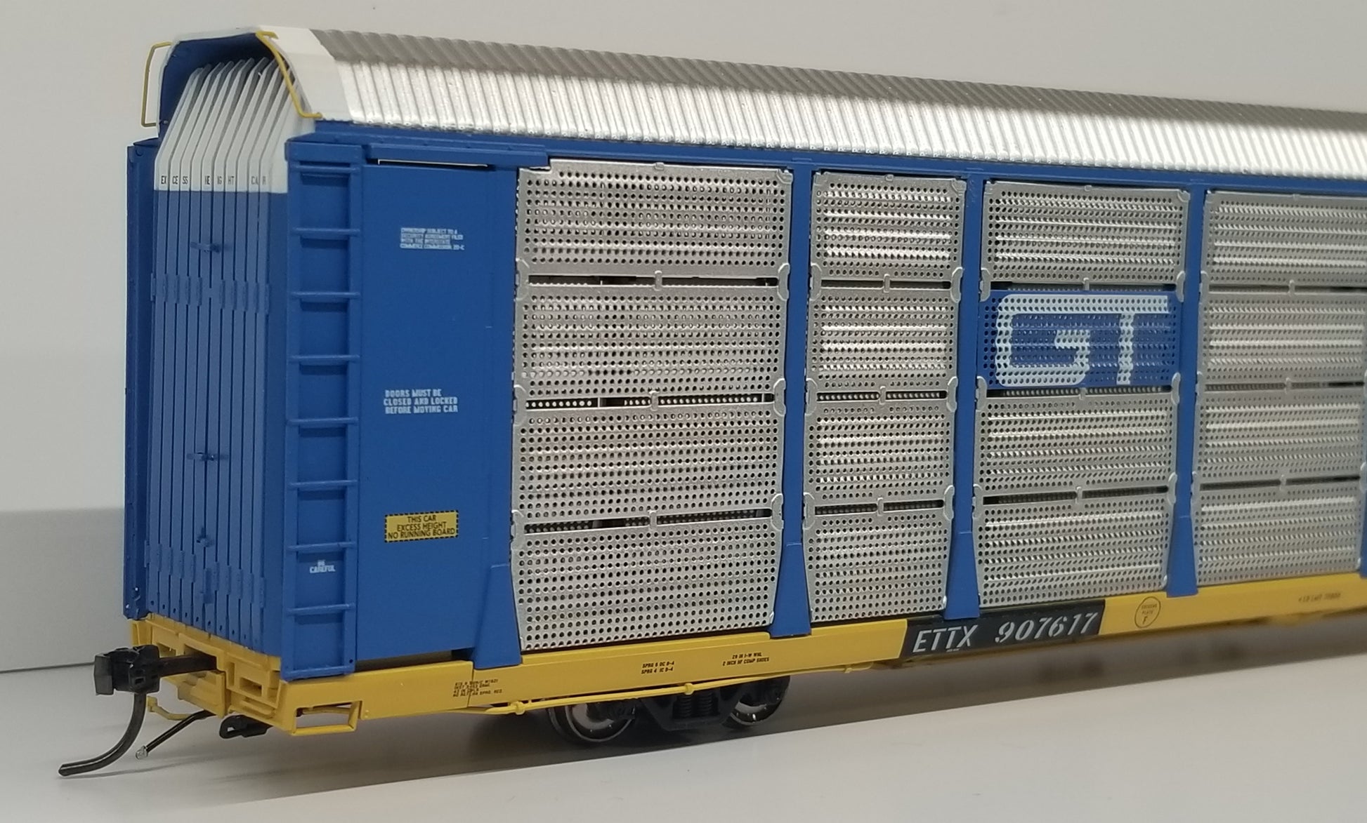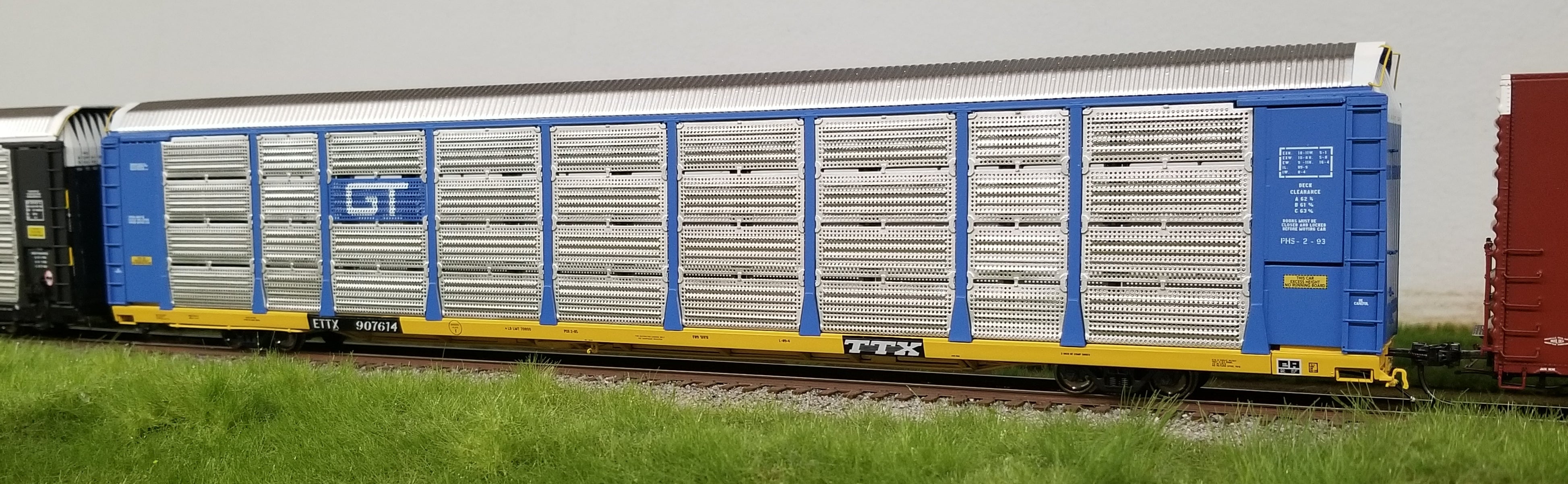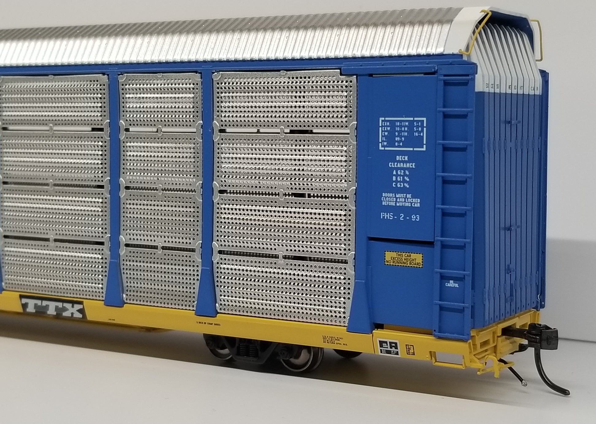 production run of our tri level autoracks feature the Portec rack bodies with RAVE1 (ski slope) doors mounted to both NSC and P-S F89 flat cars.