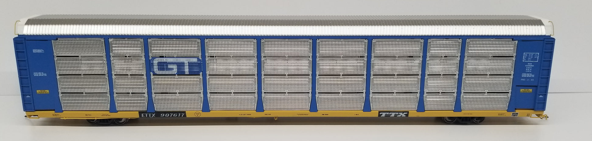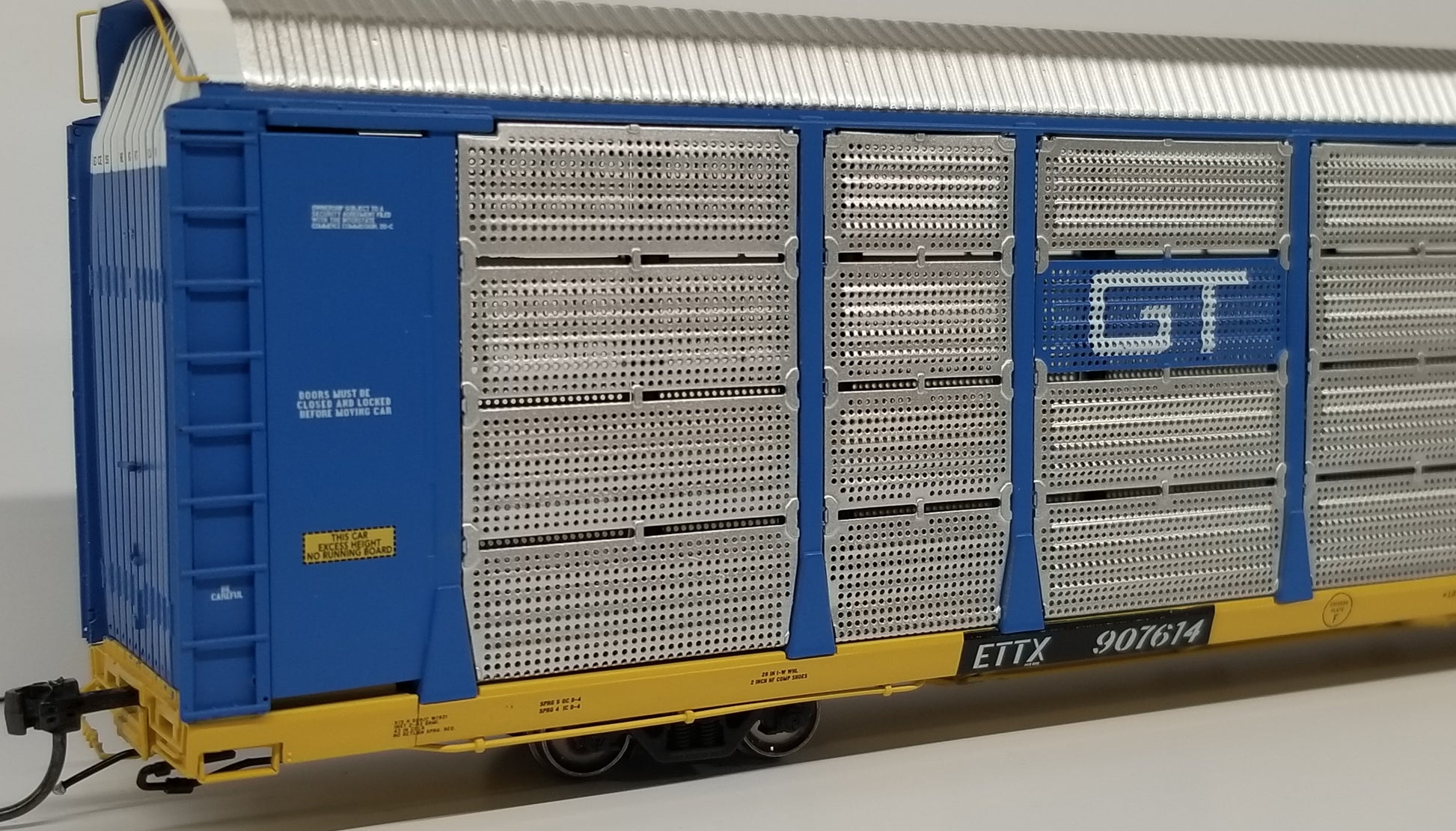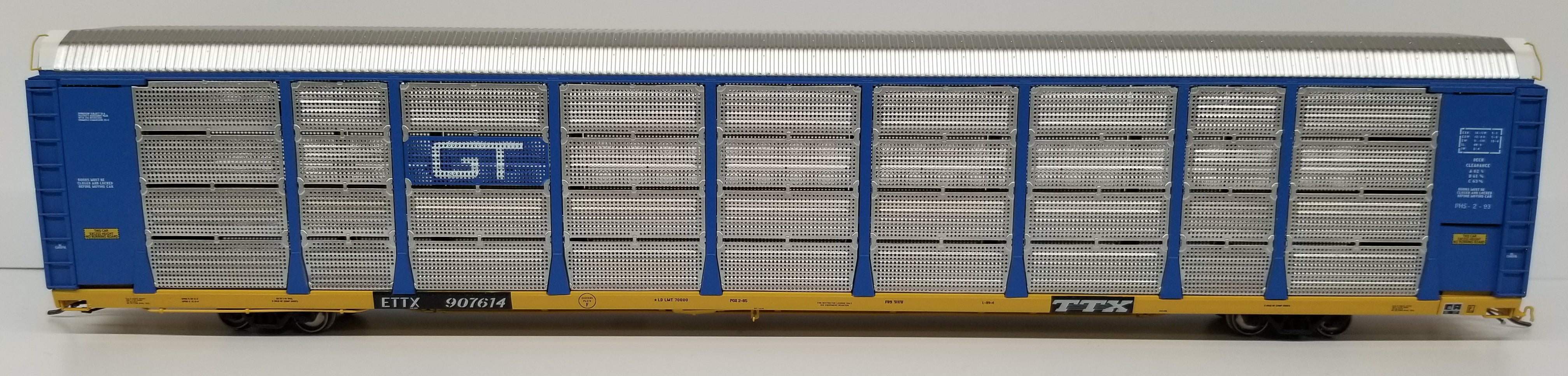 production run of our tri level autoracks feature the Portec rack bodies with RAVE1 (ski slope) doors mounted to both NSC and P-S F89 flat cars.