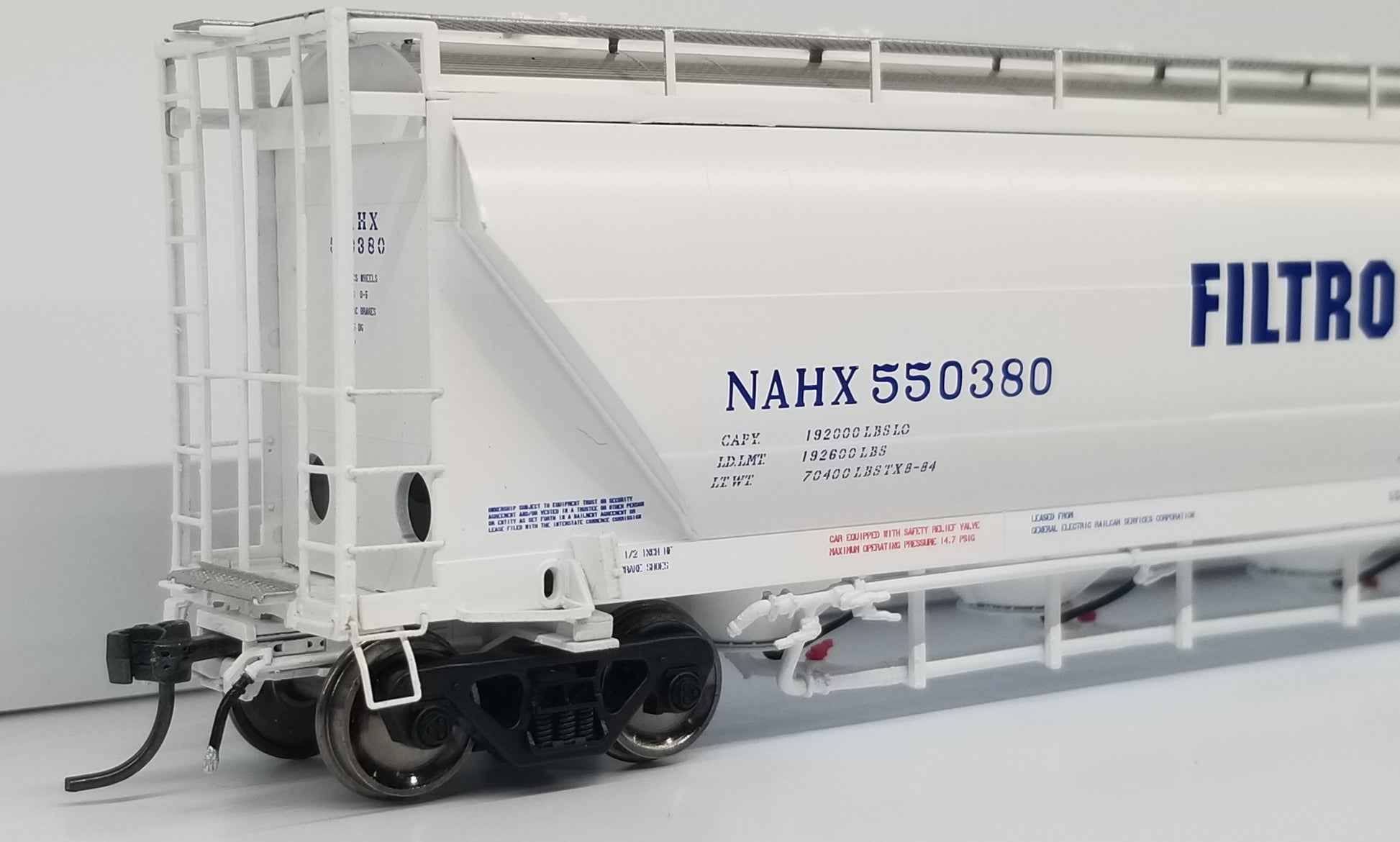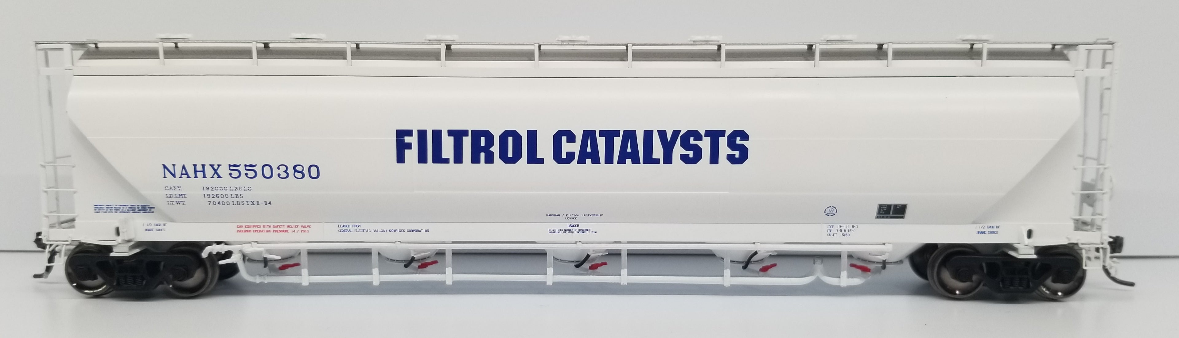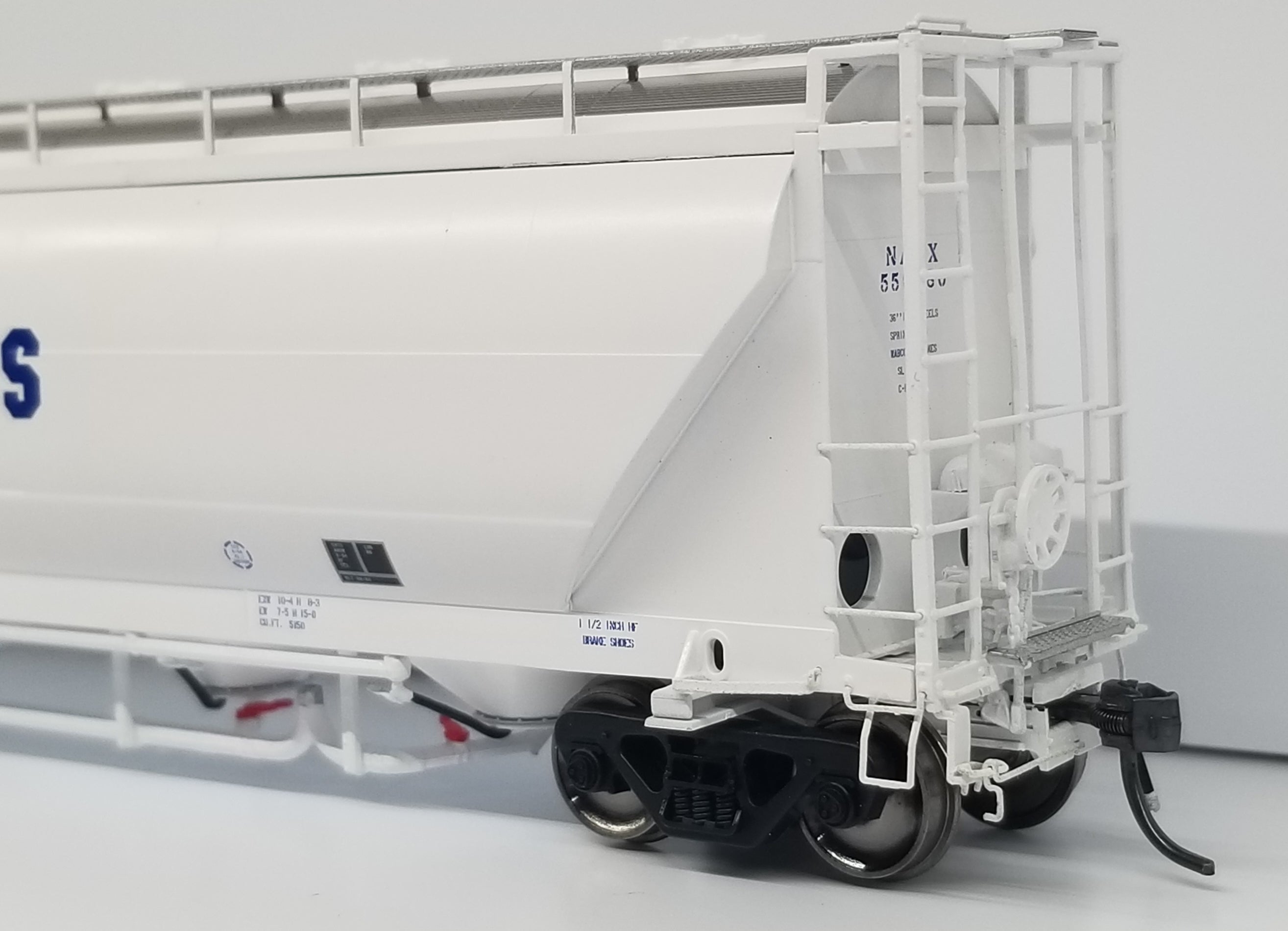 hopper designed to haul flour, talc, corn starch, clays, kaolin and other powdered commodities. A majority of these 5150 cu. ft. cars were built between 1980 and 1987 in Murfreesboro, TN at the Butler Manufacturing plant. Then in late 1980s, NACC went bankrupt and sold their cars to GE Rail Services while Trinity purchased the rights of the design from NACC. Trinity began producing a 5125 cu. ft. hopper in 1988, with a variety of differences in the design. This included changes to the exterior of the car including a different panel configuration and a wider end cage that “hung” off the side of the car.