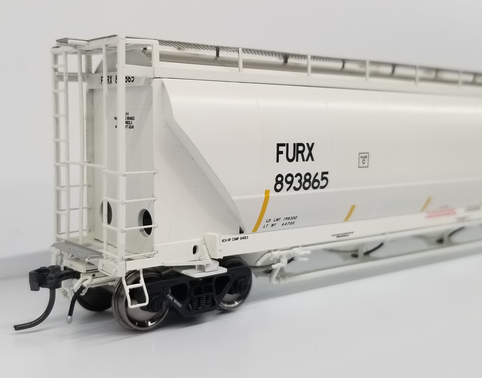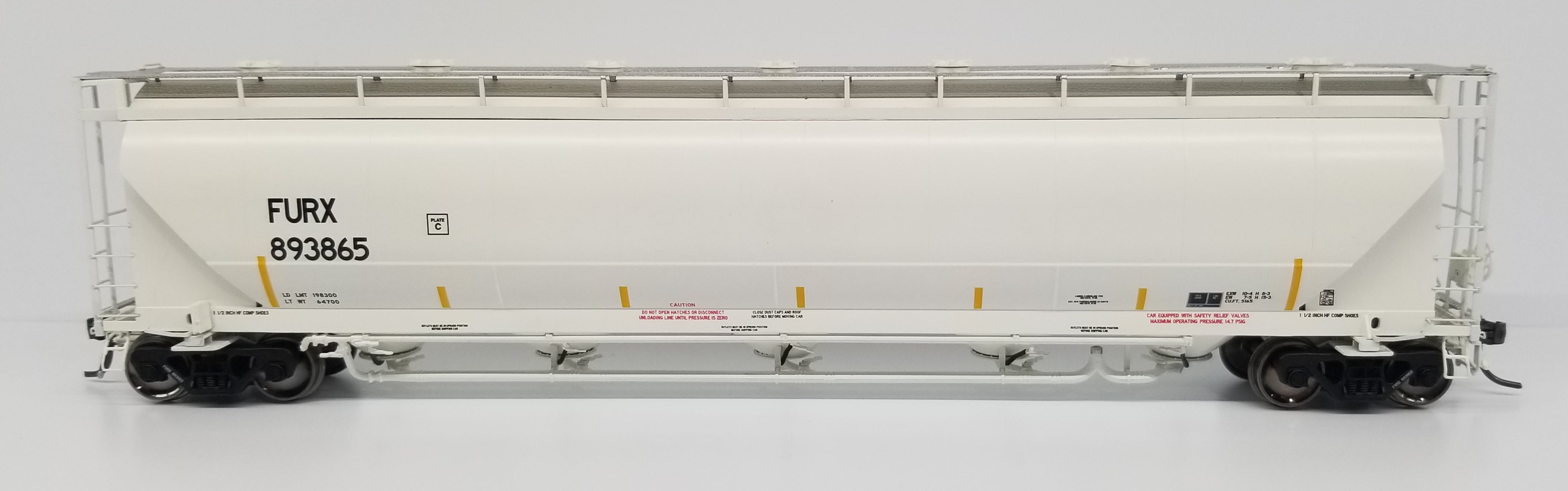 hopper designed to haul flour, talc, corn starch, clays, kaolin and other powdered commodities. A majority of these 5150 cu. ft. cars were built between 1980 and 1987 in Murfreesboro, TN at the Butler Manufacturing plant. Then in late 1980s, NACC went bankrupt and sold their cars to GE Rail Services while Trinity purchased the rights of the design from NACC. Trinity began producing a 5125 cu. ft. hopper in 1988, with a variety of differences in the design. This included changes to the exterior of the car including a different panel configuration and a wider end cage that “hung” off the side of the car.