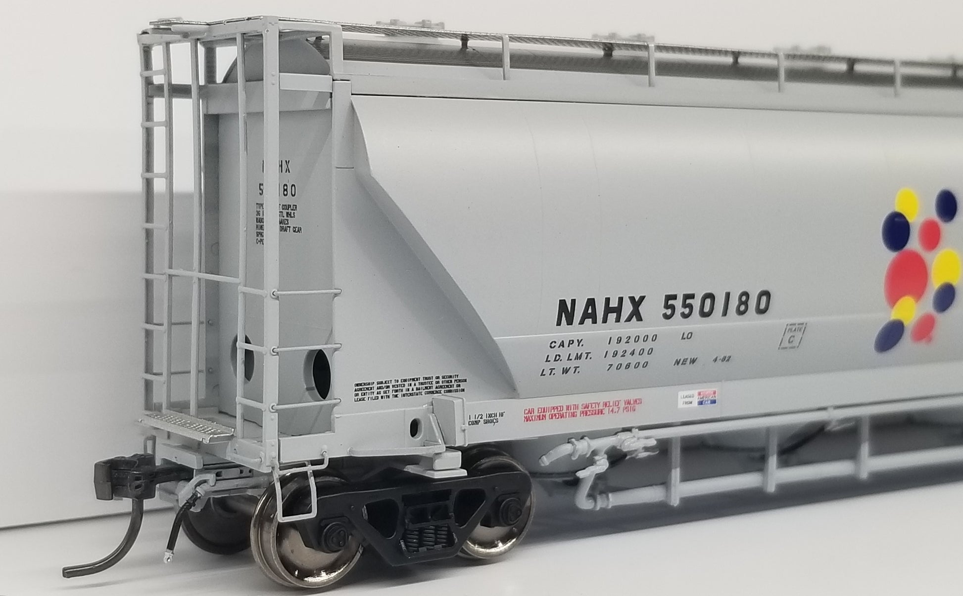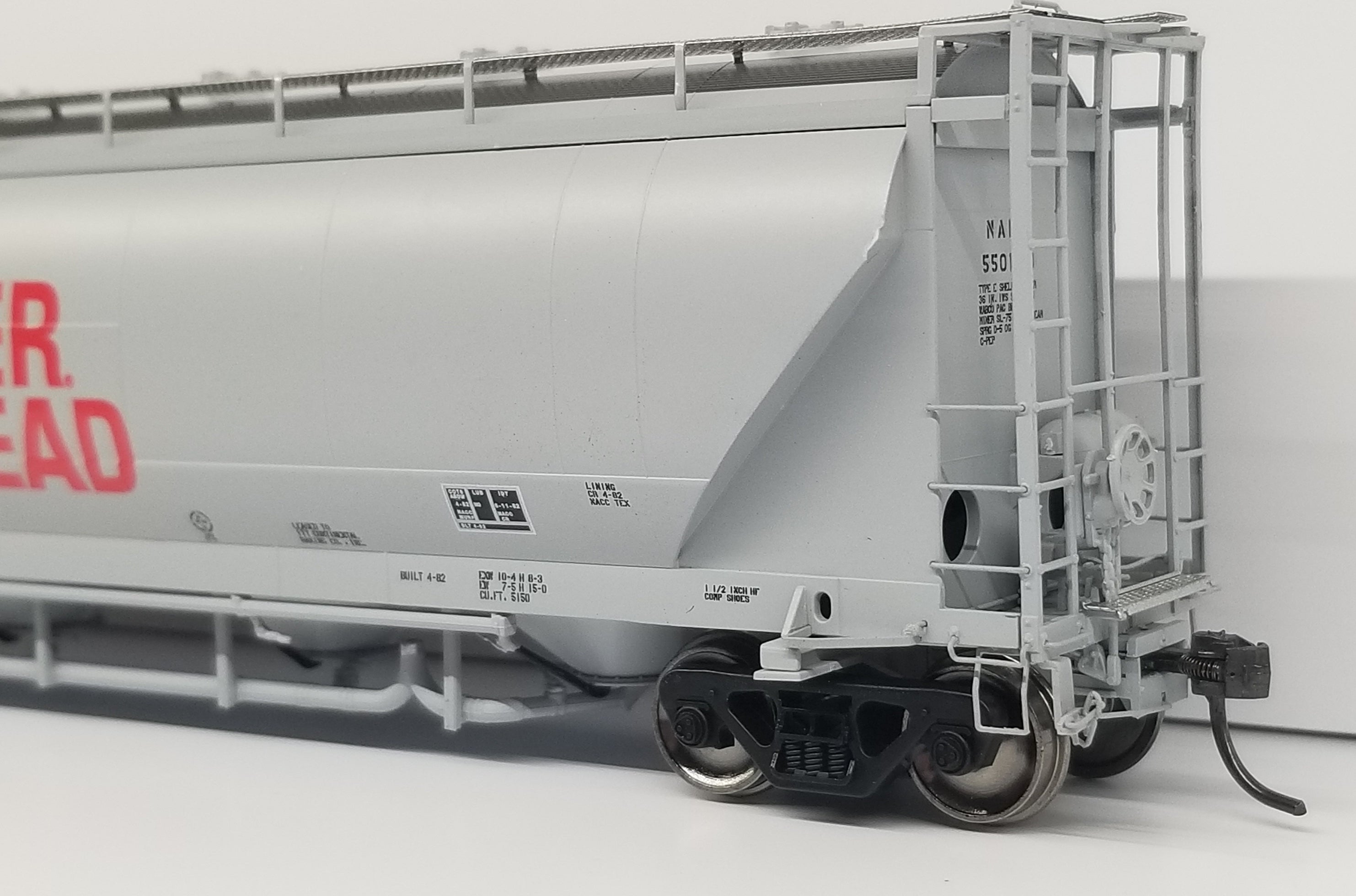 hopper designed to haul flour, talc, corn starch, clays, kaolin and other powdered commodities. A majority of these 5150 cu. ft. cars were built between 1980 and 1987 in Murfreesboro, TN at the Butler Manufacturing plant. Then in late 1980s, NACC went bankrupt and sold their cars to GE Rail Services while Trinity purchased the rights of the design from NACC. Trinity began producing a 5125 cu. ft. hopper in 1988, with a variety of differences in the design. This included changes to the exterior of the car including a different panel configuration and a wider end cage that “hung” off the side of the car.