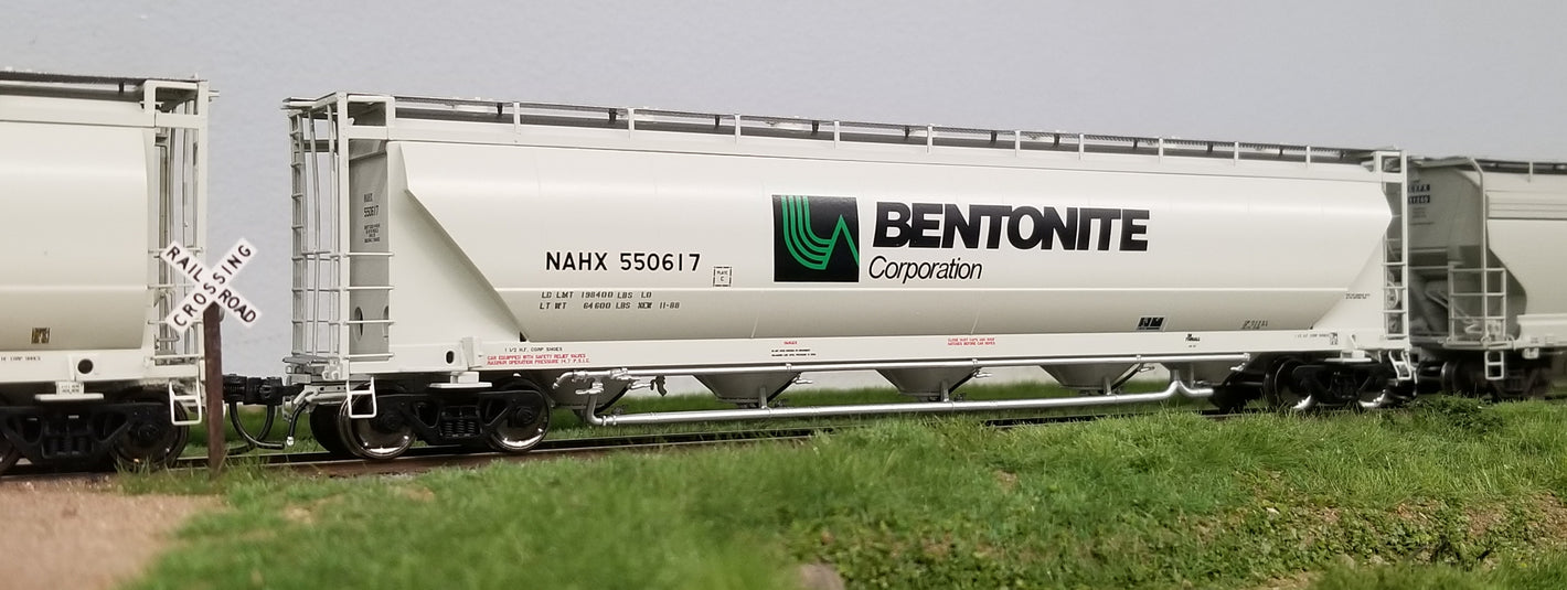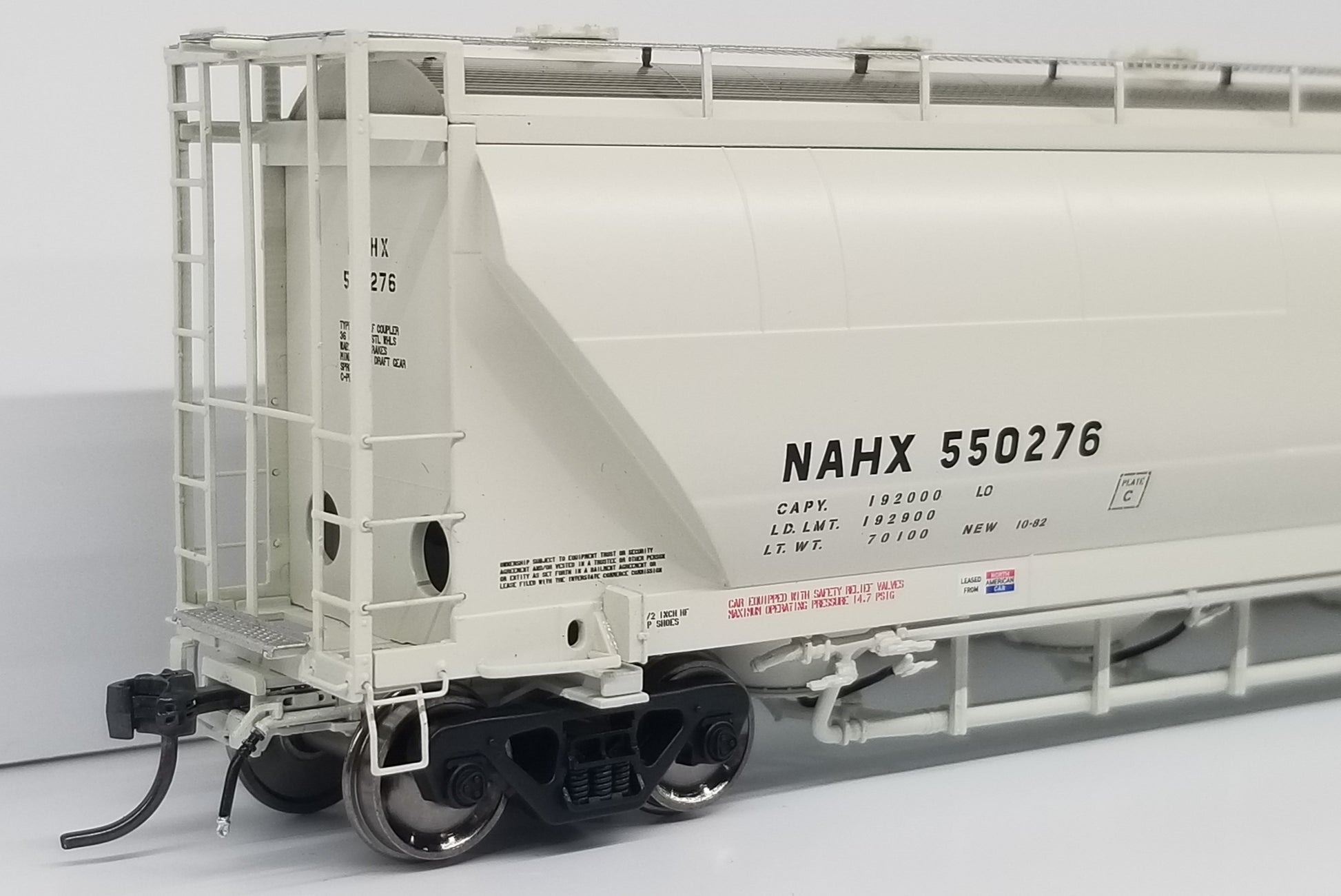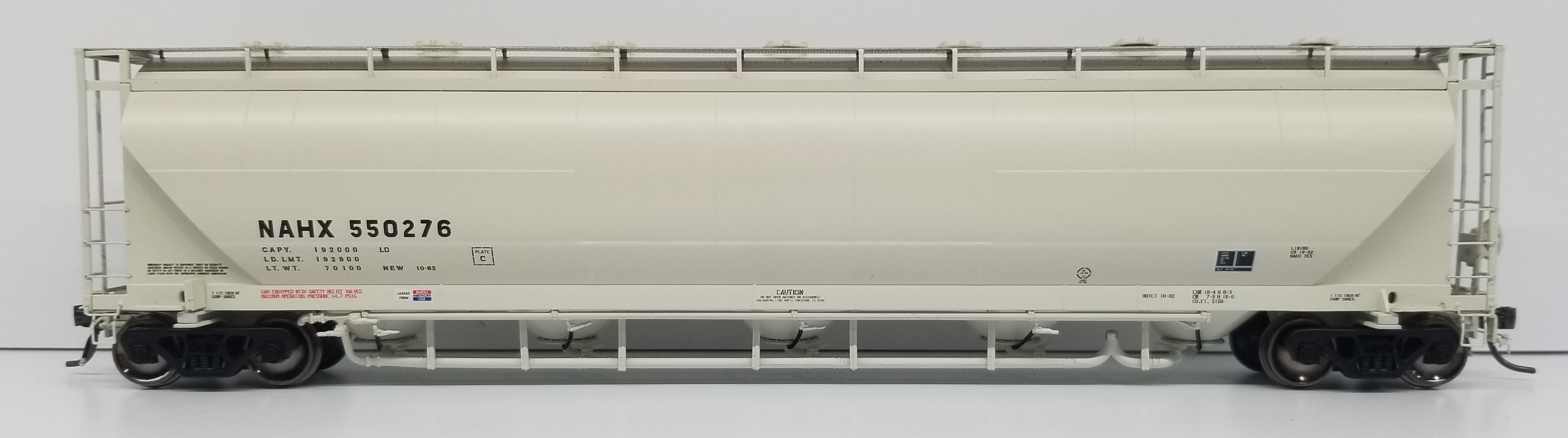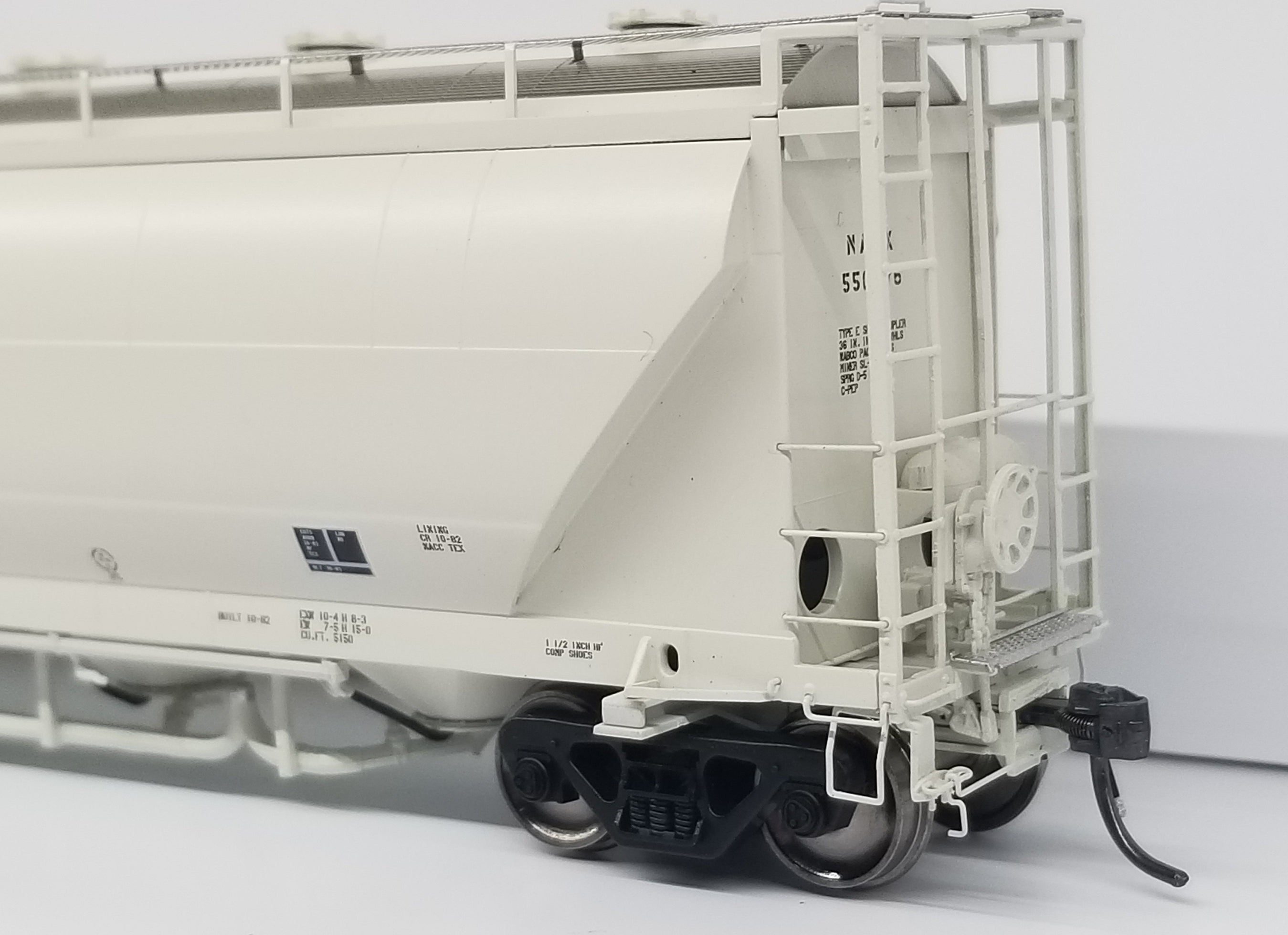 hopper designed to haul flour, talc, corn starch, clays, kaolin and other powdered commodities. A majority of these 5150 cu. ft. cars were built between 1980 and 1987 in Murfreesboro, TN at the Butler Manufacturing plant. Then in late 1980s, NACC went bankrupt and sold their cars to GE Rail Services while Trinity purchased the rights of the design from NACC. Trinity began producing a 5125 cu. ft. hopper in 1988, with a variety of differences in the design. This included changes to the exterior of the car including a different panel configuration and a wider end cage that “hung” off the side of the car.