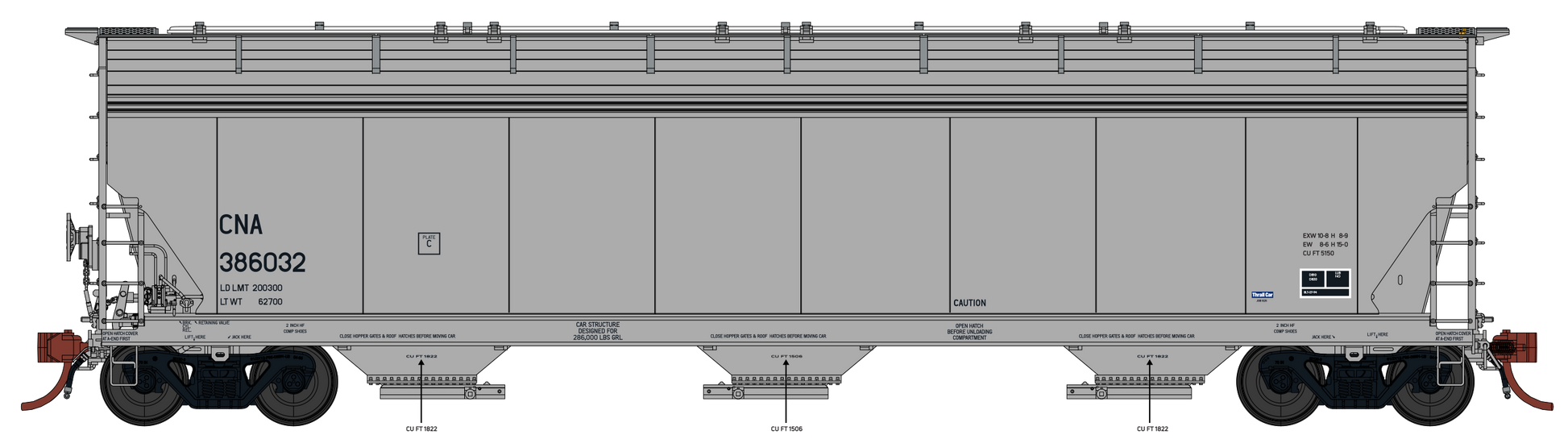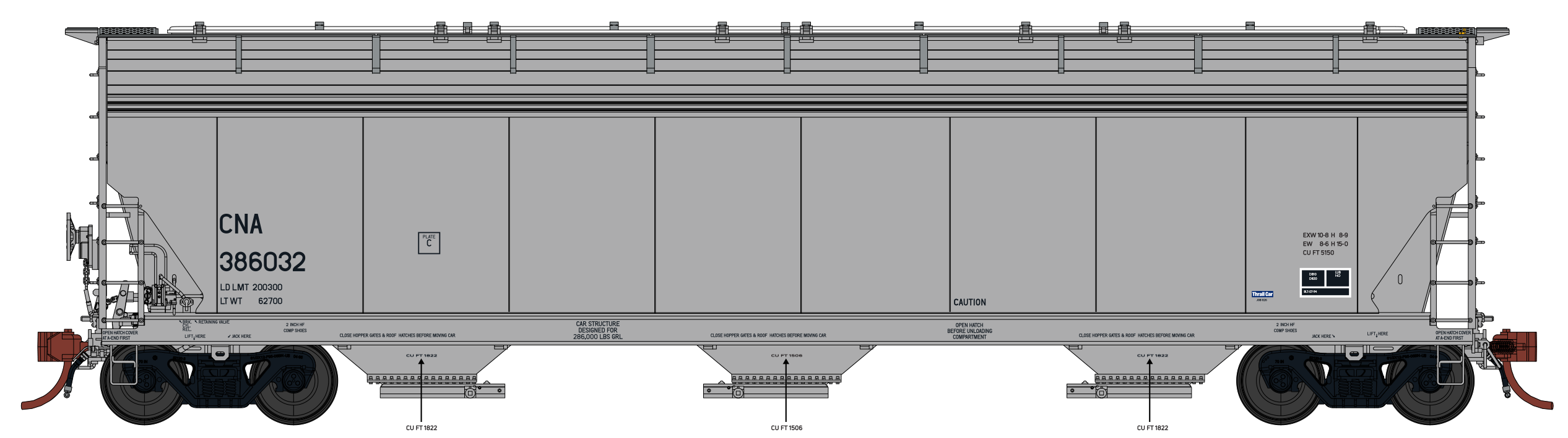 The Thrall 5150s were built between 1994 and 2001. They feature a couple of different phase variations including brake components, stirrups, roping equipment as well as outlet gates. The 5150s were known for being in grain service, but ventured into other commodities including dry chemicals and sugar. With over 8000 built, these cars continue to be a staple in manifest trains and can be found all throughout North America.